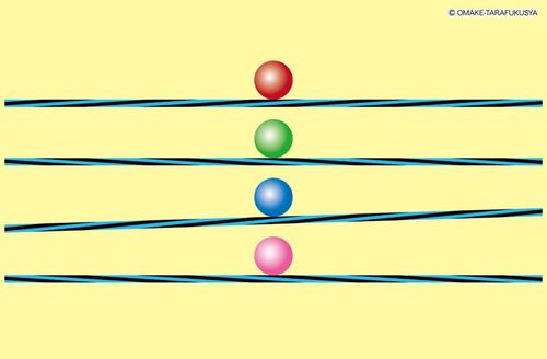 今日のエントリーは錯視クイズです。 板の上にそれぞれボールが置いてあります。 この中で一つだけ、転がりだすボールがあります。 はたしてどの色のボールが転がってしまうでしょうか? 正解はこちらをクリック→ ちょっと簡単すぎたかな? ↓他にも錯視やト…